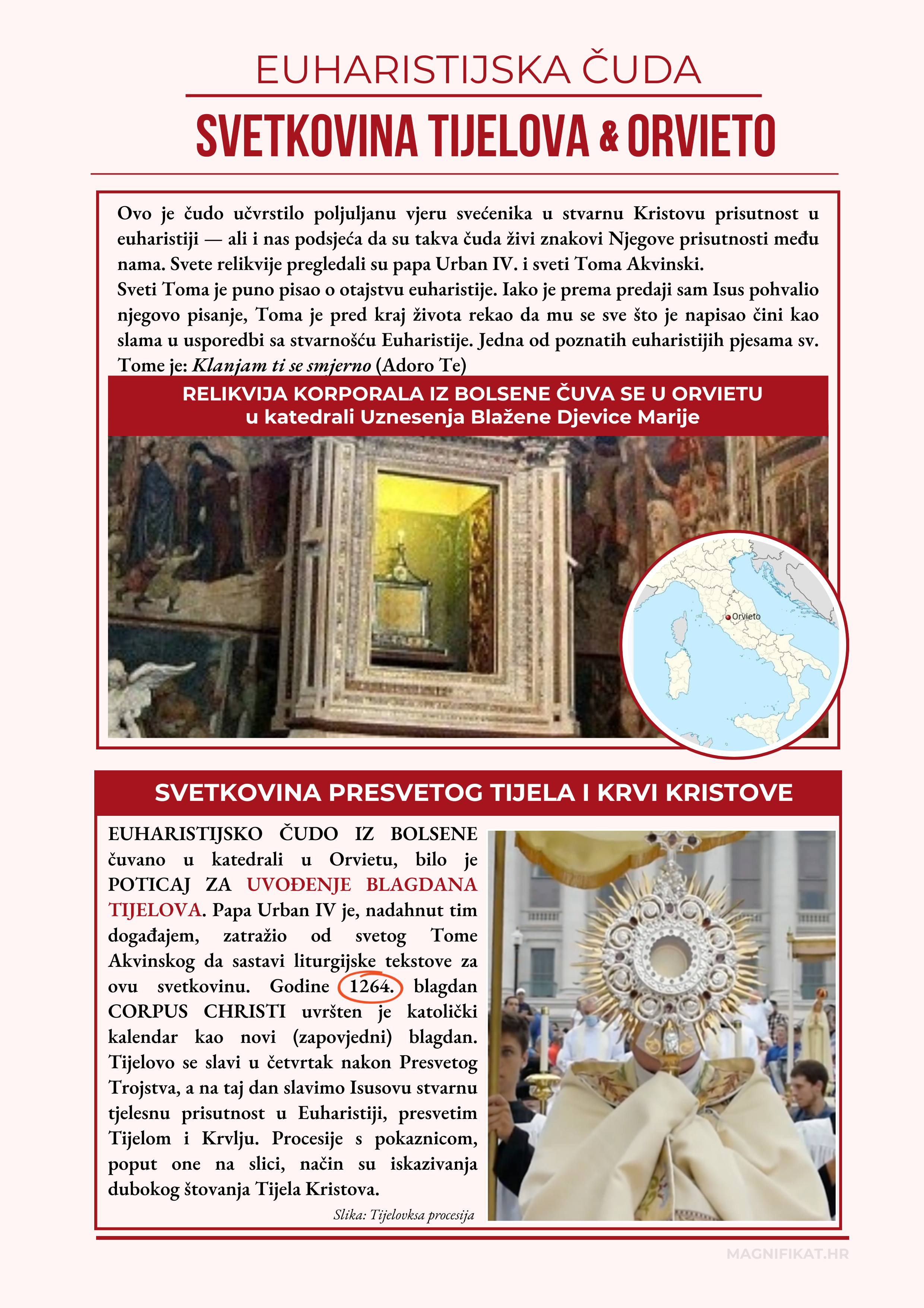 Godine 1263. u malom mjestu Bolsena, smještenom uz veliko jezero otprilike 18 kilometara jugozapadno od grada Orvieta, dogodilo se jedno od najpoznatijih euharistijskih čuda. Njemački svećenik, otac Petar, koji je bio na hodočašću prema Rimu, slavio je svetu misu u Bolseni. Međutim, on je sumnjao u stvarnu prisutnost Krista u euharistiji. Upravo u trenutku posvete, hostija je počela krvariti, što je izazvalo veliko čuđenje i strahopoštovanje. Prekinuvši misu, svećenik je odmah otišao u Orvieto, gdje je u to vrijeme papa Urban IV boravio sa papinskim osobljem. Budući da je Orvieto bio važan papinski centar unutar Papinske Države, čudo iz Bolsene tamo je dobilo svoju službenu potvrdu. Zbog toga se i danas euharistijsko čudo slavi upravo u Orvietu, u katedrali koja je postala veliko hodočasničko mjesto.